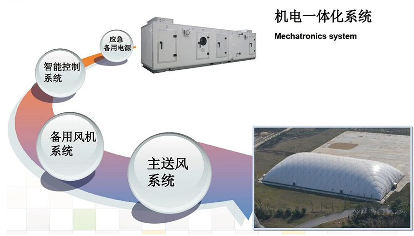 一般由圈梁基礎(chǔ)、膜體、充氣機(jī)械系統(tǒng)、控制與監(jiān)控系統(tǒng)、電設(shè)計(jì)系統(tǒng)和進(jìn)出口系統(tǒng)組成(空調(diào)與新風(fēng)機(jī)選配)。