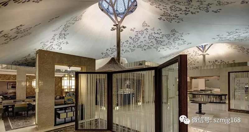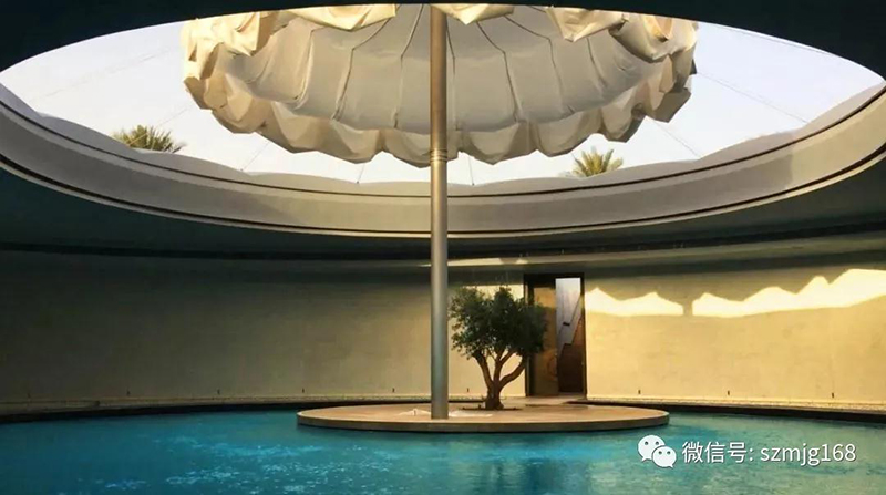 以及阿布扎比的一個(gè)私人會(huì)所,泳池上方有個(gè)大天窗,中間有10米高大傘,可根據(jù)天氣打開或合上。