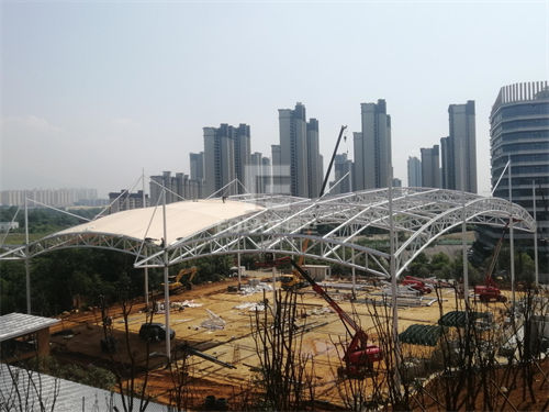 在與甲方洽談后,設(shè)計(jì)師決定采用骨架式膜結(jié)構(gòu)方案,是以鋼結(jié)構(gòu)為承重骨架、并在骨架上敷設(shè)膜材的結(jié)構(gòu)形式。膜選用的是材料優(yōu)質(zhì)、厚度適中、自潔性強(qiáng)、經(jīng)久耐用的白色膜,鋼結(jié)構(gòu)選用的是抗拉強(qiáng)度和屈服點(diǎn)高、耐腐蝕性高、沖擊韌性好、塑性好、耐久性好的鋼材。深圳市佛蘭空間膜結(jié)構(gòu)有限公司項(xiàng)目施工人員將膜材料敷設(shè)于鋼結(jié)構(gòu)上形成了一個(gè)大跨度、高度適中、寬敞明亮的風(fēng)雨門球場。安裝完工的膜結(jié)構(gòu)整體顏色與公園周邊景色十分協(xié)調(diào),它獨(dú)特的白色造型,為園區(qū)新添了一道靚麗風(fēng)景線,堪稱“省內(nèi)一流的膜結(jié)構(gòu)4連片風(fēng)雨門球場”。