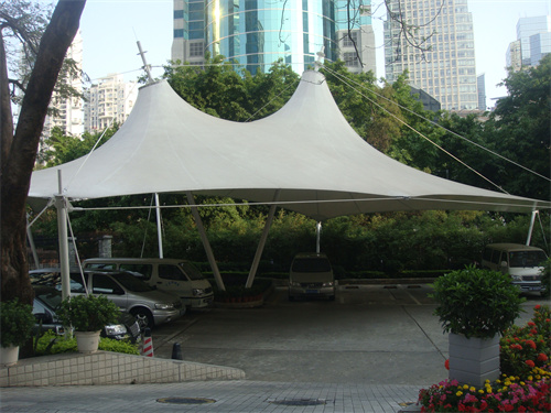 膜結(jié)構(gòu)停車棚是車輛遮陽避雨的港灣,它以建筑織物,即膜材料為張拉主體,與支撐構(gòu)件或拉索共同組成的結(jié)構(gòu)體系,膜結(jié)構(gòu)車棚憑其新穎獨(dú)特的建筑造型,良好的受力特點(diǎn)已成為大跨度空間結(jié)構(gòu)的主要形式之一。