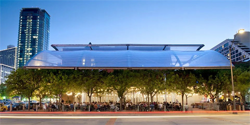 ETFE薄膜允許紫外線透射,可保證樹木健康生長(zhǎng),而在ETFE薄膜上印銀點(diǎn)就能為用餐者提供一定程度的陰影,最后結(jié)構(gòu)頂部的通風(fēng)口可以讓暖空氣逸出,樹木和用餐者都會(huì)很舒適。該餐廳膜結(jié)構(gòu)形狀和跨度圍繞樹冠設(shè)計(jì),ETFE材料的運(yùn)用實(shí)現(xiàn)了人與自然的和諧相處。