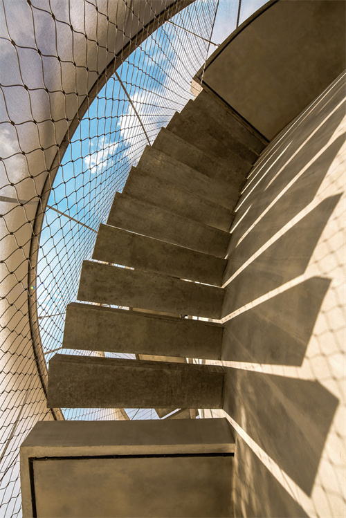 這座高23米造型獨(dú)特的餐廳足以吸引全島的目光。建筑使用鋼筋混凝土作為主要材料,金屬網(wǎng)和膜結(jié)構(gòu)作為建筑立面,垂直的桶狀構(gòu)造既是它的支撐結(jié)構(gòu)也是建筑的主體,外圍使用預(yù)制樓板制成的主樓梯盤旋而上。