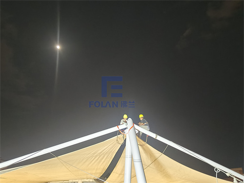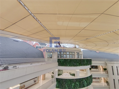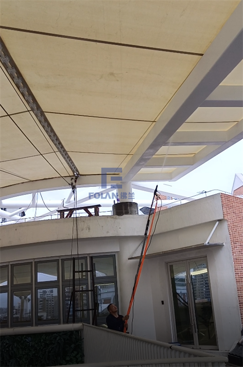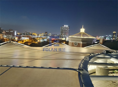 因幼兒園白天上課,所以項(xiàng)目只能周末和晚上施工,佛蘭空間項(xiàng)目施工人員趕工夜戰(zhàn),歷時(shí)20天完成了該扇形中庭膜結(jié)構(gòu)的安裝。