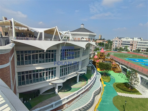佛蘭空間設(shè)計(jì)和項(xiàng)目施工人員,經(jīng)過結(jié)構(gòu)優(yōu)化設(shè)計(jì)、變形分析、安裝措施及高精度測量控制,最大限度消除了安裝過程中可能帶來的結(jié)構(gòu)的變形,保證了該幼兒園中庭膜結(jié)構(gòu)的美觀性,同時(shí)還為小朋友玩耍提供了一個(gè)能遮陽擋雨的溫馨空間。