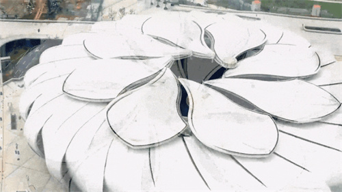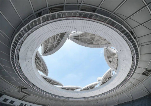 杭州奧體中心體育場(chǎng)屋頂由28片花瓣和27片小花瓣構(gòu)成,遠(yuǎn)看好似一朵綻放在錢塘江畔的“蓮花”,十分動(dòng)感飄逸。
