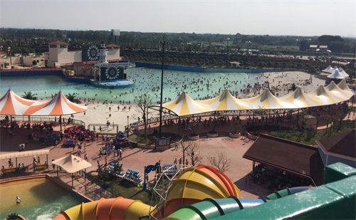 如今,很多主題樂園里的游戲場(chǎng)所,都會(huì)在游樂設(shè)施的上方設(shè)置膜結(jié)構(gòu)頂篷,既可起到遮陽的作用,又能增強(qiáng)游樂設(shè)施的視覺效果。下面這2個(gè)主題公園和水上樂園,就恰如其分地運(yùn)用膜結(jié)構(gòu)發(fā)揮其遮陽擋雨效果。