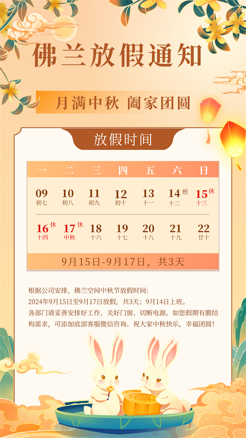 為了讓大家充分享受與家人團(tuán)聚的時(shí)光,佛蘭空間將于2024年9月15日開始放假,假期共計(jì)3天,2024年9月18日重返工作崗位。如假期您有膜結(jié)構(gòu)需求,可添加底部客服微信咨詢哦!