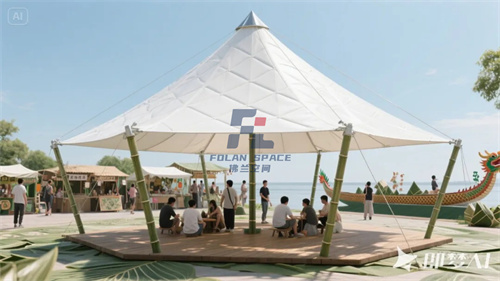 五月的風(fēng)裹挾著粽香,龍舟的鼓點喚醒盛夏。端午節(jié)不僅是文化的傳承,更是匠心的延續(xù)。今年,佛蘭空間以「膜」為筆,將千年傳統(tǒng)與現(xiàn)代科技糅合成一場空間藝術(shù)的盛宴——用輕盈的膜結(jié)構(gòu),為城市編織遮風(fēng)避雨的“粽葉”,為未來書寫“龍舟競渡”的篇章。