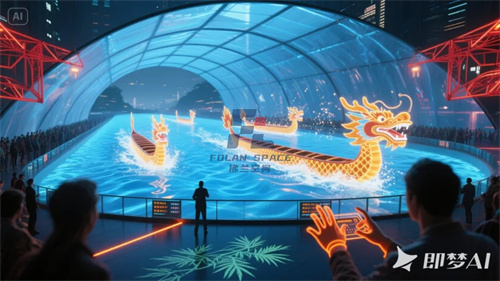 2、商業(yè)互動:商場中庭“AR賽龍舟”,投影膜化身虛擬河道,觀眾手勢操控競渡游戲。