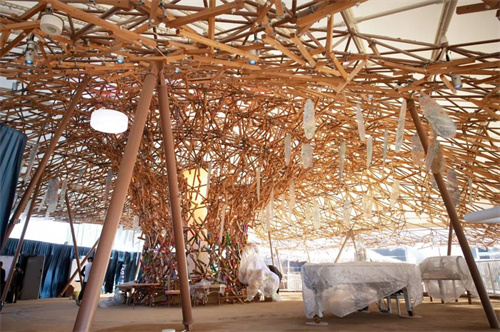 水母館內(nèi)部的核心裝置名為“創(chuàng)造之樹”,由約4,600塊吉野杉木方材精密組裝而成,運(yùn)用黏菌算法構(gòu)建出復(fù)雜的水母形態(tài)波動(dòng)結(jié)構(gòu)。