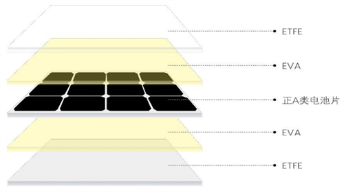 在國(guó)內(nèi)光伏電池業(yè)內(nèi),ETFE薄膜已經(jīng)開(kāi)始應(yīng)用于柔性光伏電池封裝材料,擺脫鋼化玻璃,組件由五層組成:上層ETFE膜、EVA層、電池片層、EVA層、下層ETFE。電池片的厚度還不到1mm,重量?jī)H為1KG/平方米,真正實(shí)現(xiàn)了柔性化和便攜化。