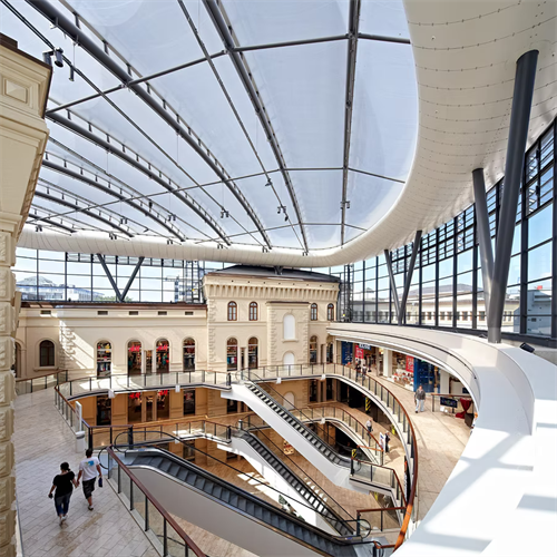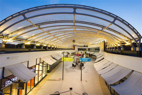 ▲零售店街道被ETFE氣枕系統(tǒng)覆蓋,營造出迷人的透明屋頂,為游客提供輕松的購物體驗。