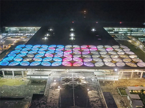 ▲14314平方米的屋頂,包括84個雙層氣枕,頂層有63%的印點圖案,能減少陽光的穿透,為乘客提供下雨等天氣的保護(hù)。