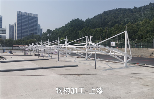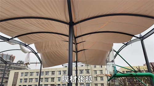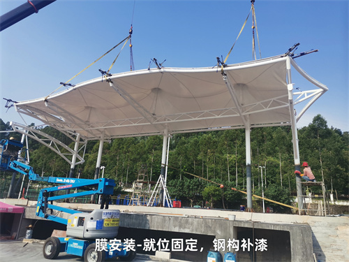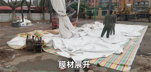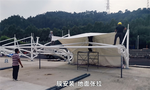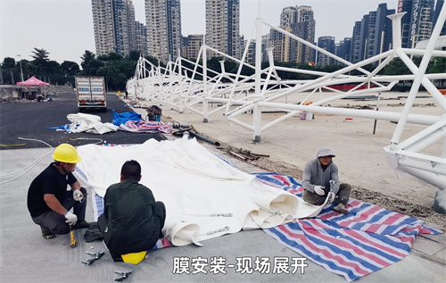 膜結(jié)構(gòu)的安裝施工方法通常有以下步驟:基礎(chǔ)準(zhǔn)備→支撐構(gòu)件(鋼結(jié)構(gòu))的制作、施工、安裝→膜材的制作、安裝與清洗。