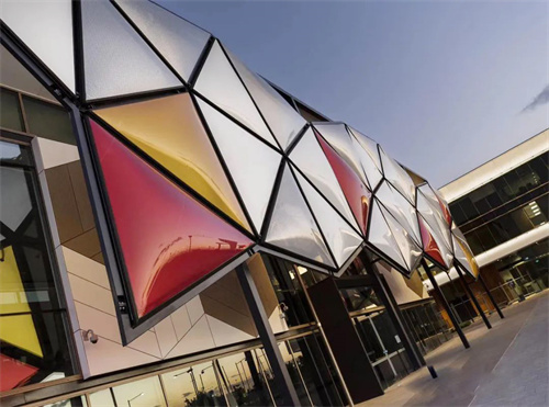 新的OranPark圖書館外立面,由31個三角形氣枕組成,氣枕設(shè)計成四種顏色:紅色,黃色,白色以及透明鍍點(diǎn),以此滿足不同部位室內(nèi)環(huán)境對陽光的需求。背面均采用透明ETFE膜,此外還增加了LED照明系統(tǒng),為夜間增加不同的視覺效果。