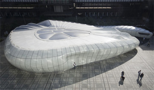 展覽館有機(jī)體的外形由一系列輕質(zhì)曲面組件構(gòu)成。