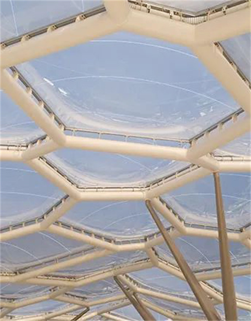 這個37米高的外殼由一個裸露的鋼斜架建造,外覆一層半透明的墊層,墊層由聚氟乙烯(ETFE)和輕質(zhì)特氟隆聚合物制成,稱為氣枕式ETFE膜結(jié)構(gòu)。這種材料具有絕緣玻璃的隔熱性能,而僅相當(dāng)于絕緣玻璃的一小部分重量。