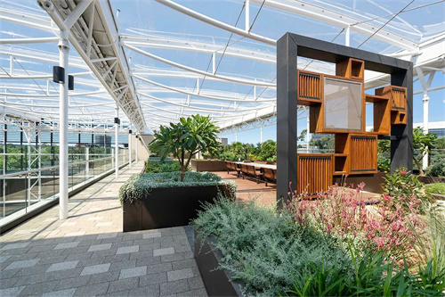 ETFE屋頂覆蓋了兩座建筑的頂層屋頂花園,并在藝術(shù)區(qū)建筑的中間形成了一個內(nèi)部中庭,將麥考瑞大學(xué)藝術(shù)區(qū)大樓連接在一起。