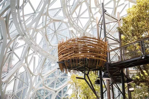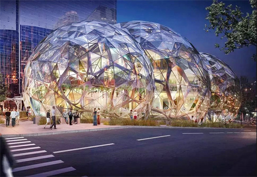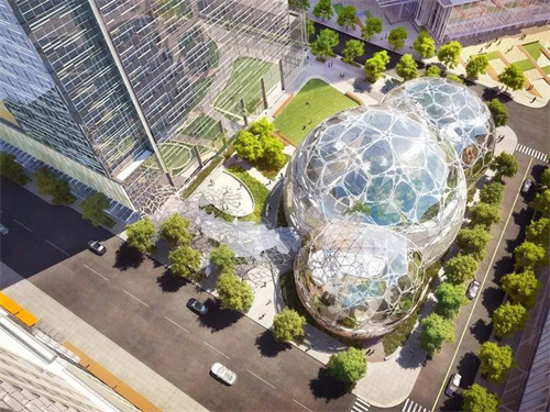 AmazonSpheres是項(xiàng)目最核心的“熱帶雨林"部分,由3個大的球狀體組成,其中最大的球狀體直徑39米,高27米,共四層。據(jù)說,整個建筑使用了2643片透明玻璃和620噸鋼。