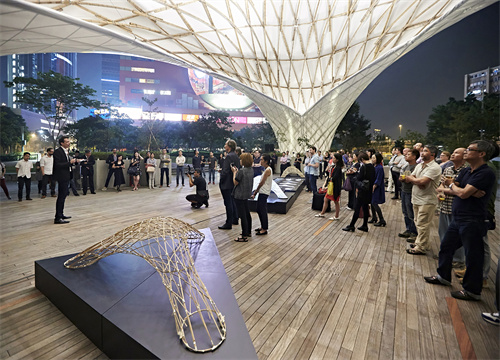 竹亭由475個(gè)大竹桿構(gòu)成,這些竹桿在現(xiàn)場(chǎng)彎曲以形成所需的形狀,并使用廣東傳統(tǒng)搭棚技術(shù),用金屬絲將這些竹子連接在一起。竹亭是一個(gè)大的斜面殼結(jié)構(gòu),由三角網(wǎng)格結(jié)構(gòu)向下折疊而成,組成的三個(gè)空心柱固定于混凝土地基上,并配上定制的法拉利張拉膜材,射燈則從空心柱中照亮整個(gè)竹亭。