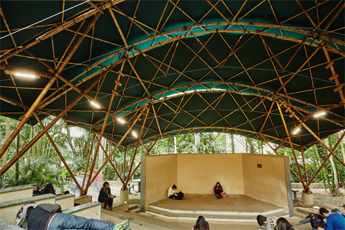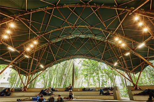該項(xiàng)目位于巴西里約熱內(nèi)盧天主教大學(xué)的綠色校園內(nèi),室外階梯上部為可伸縮的自由形式屋頂。屋頂利用竹結(jié)構(gòu)與預(yù)應(yīng)力亞克力薄膜,構(gòu)成自應(yīng)力彎曲梁和抗拉性良好的伸縮網(wǎng),形成雙曲面,避免結(jié)構(gòu)構(gòu)件的彎曲。