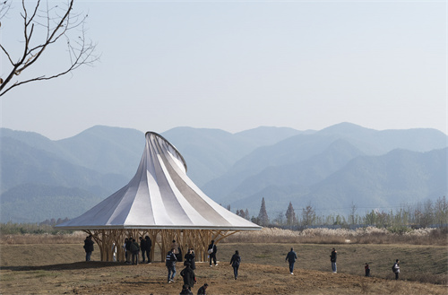 天空湖亭,又名竹燈籠劇場(chǎng)。該項(xiàng)目是一個(gè)臨時(shí)性的戶外劇場(chǎng),位于安吉的一個(gè)湖邊,四周山水環(huán)繞,一座竹膜建筑矗立于中央,輕盈獨(dú)特。