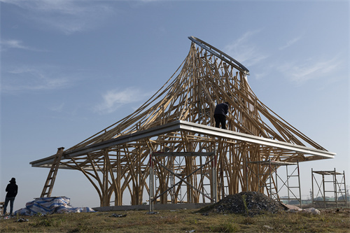 當(dāng)然,在制作過(guò)程中,圓孔處的鋼環(huán),屋檐處的方形鋼架,以及嵌入結(jié)構(gòu)底部混凝土基礎(chǔ)中的板材等一系列不同構(gòu)件都不可忽略。這些構(gòu)件提供了框架與模板,才能完美地連接起每一根竹子。