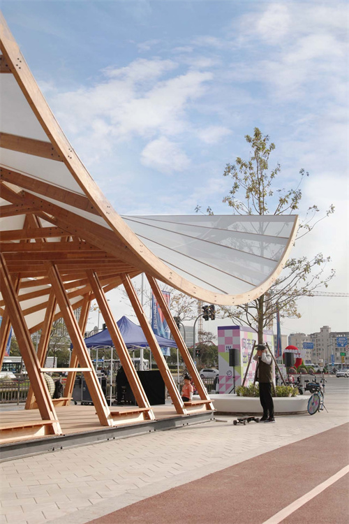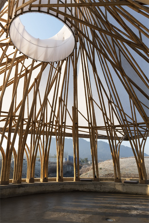 劇院下部結(jié)構(gòu)由竹子組成,竹子排列錯(cuò)落有致,頂部采用白色膜材覆蓋,竹木結(jié)構(gòu)與膜結(jié)構(gòu)碰撞,提供了一種不同的空間體驗(yàn)。