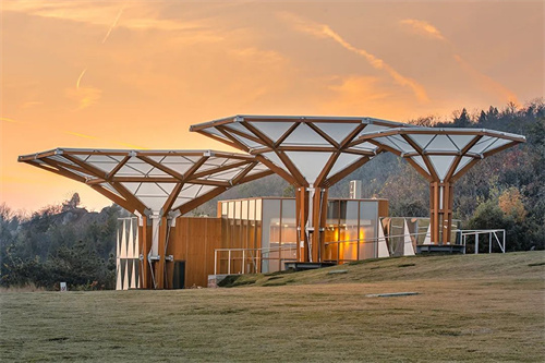 膜結(jié)構(gòu),憑其質(zhì)輕、透光性好、輕盈自潔、建設(shè)周期快、環(huán)保節(jié)能等優(yōu)勢(shì),已在現(xiàn)代建筑中得到了廣泛的應(yīng)用。我們?nèi)粘=佑|最多的就是鋼膜結(jié)構(gòu),兼具力度及輕柔之美。而竹膜結(jié)構(gòu),輕柔之中增加了幾分古樸與自然,使得建筑兼具傳統(tǒng)與新潮之美。