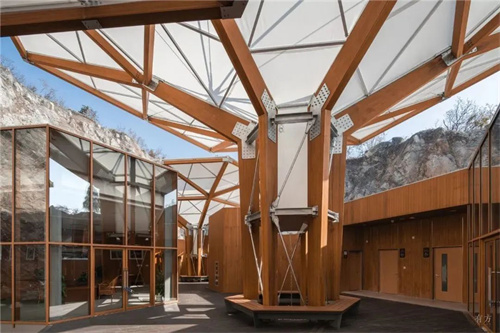 為了讓傘冠呈現(xiàn)出一種“輕薄”的效果,膜材采用30%的透光率,設(shè)計(jì)團(tuán)隊(duì)采用了拉桿、拉索和集成竹梁共同作用的受力體系,這個(gè)鋼鉸節(jié)點(diǎn)投在膜材上的陰影讓人不禁聯(lián)想到了日晷。
