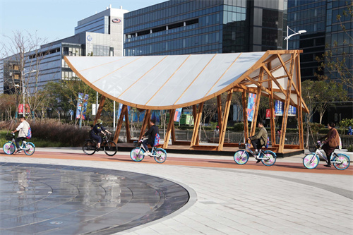 作為騎行的庇護(hù)小站與城市家具服務(wù)系統(tǒng)節(jié)點(diǎn)之一,騎行驛站的結(jié)構(gòu)體系從一開始就以竹、鋼為主導(dǎo)的結(jié)構(gòu)來(lái)降低碳的排放量。從主要材料的生產(chǎn)加工、材料設(shè)備運(yùn)輸、建造過(guò)程以及建筑運(yùn)營(yíng)考慮低碳綠色建造。