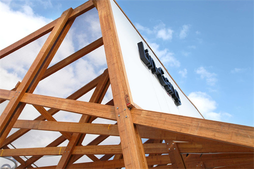 在木料的組接方式上,建筑師將木料交錯(cuò)疊壓并咬合,使木結(jié)構(gòu)的承重和維護(hù)體系合二為一,“編織”成一個(gè)穩(wěn)定的三角結(jié)構(gòu),從而可以取消斜撐。這樣直接的構(gòu)造方式使建筑結(jié)構(gòu)獲得了視覺上的確定性和統(tǒng)一性。
