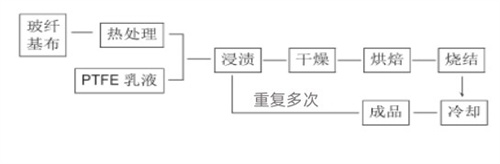 經(jīng)過浸漬后,玻纖布表面涂上了薄薄一層氟樹脂,再經(jīng)過干燥、烘焙、燒結(jié)等工序,達(dá)到玻纖布與PTFE牢固結(jié)合的目的,成為一種既具玻纖特性,又有PTFE諸多優(yōu)異性能的新型材料。