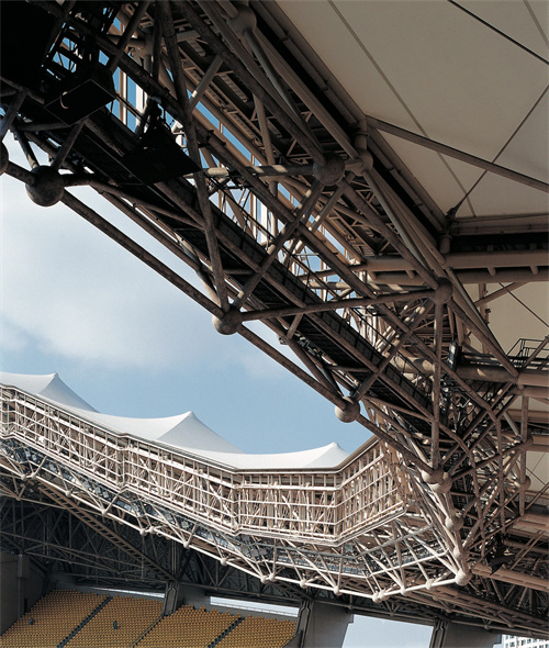 1997年在上海八萬人體育場(chǎng)舉行第七屆全國(guó)運(yùn)動(dòng)會(huì),觀眾席上方采用馬鞍形大懸挑鋼管空間屋蓋結(jié)構(gòu),覆以乳白色PTFE薄膜材料,面積為3.6萬平方米,這是中國(guó)第一次將膜結(jié)構(gòu)用在大面積的永久性建筑上。