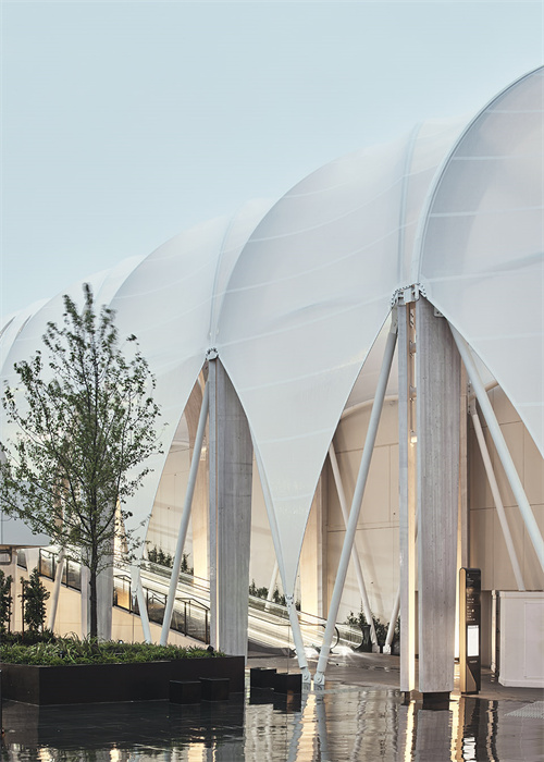 在立體花園的外側(cè)懸掛著半透明的透光率40%的PTFE網(wǎng)格膜材,在炎熱季節(jié)起到遮陽和通風(fēng)作用的同時(shí),也讓建筑看起來飄逸,輕盈,好像一層透薄柔軟的皮膚覆蓋在建筑骨架之上。