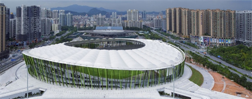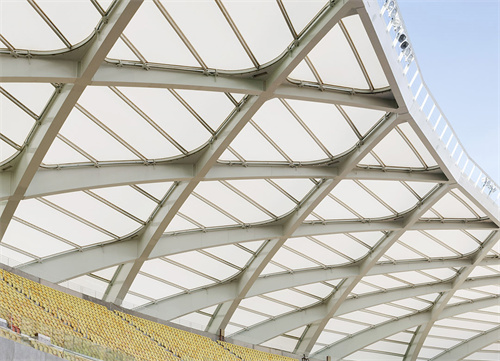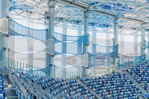 體育場頂棚是半開放式的PTFE膜結(jié)構(gòu),純白的顏色和獨(dú)特的造型引人注目,頂棚可遮蓋所有的席位,使游客坐在席位上觀看比賽免受日曬雨淋。