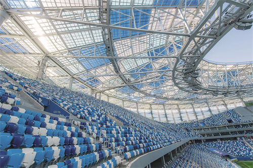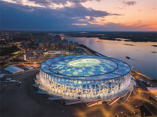 諾夫哥羅德體育場,位于伏爾加河和奧卡河的交匯處,為2018年俄羅斯世界杯興建。體育場看臺(tái)設(shè)有45000個(gè)座席,體育場的外立面由藍(lán)白兩色的PTFE膜結(jié)構(gòu)構(gòu)成。采用開放式張拉膜屋面,由46個(gè)PTFE膜結(jié)構(gòu)部分組成。