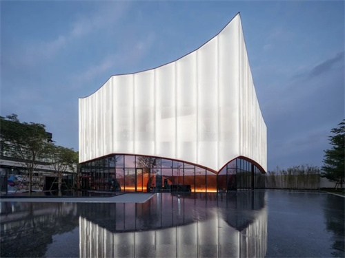 建筑師在這個項(xiàng)目中選用了28%和50%不同開孔率的PTFE網(wǎng)格膜材來達(dá)到半透明的效果,呈現(xiàn)一種欲語還休的親和力。
