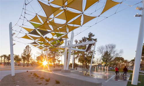 公園噴泉小廣場,是孩童玩耍嬉戲之地。噴泉頂部使用Soltis Perform92網(wǎng)孔遮陽織物做張拉帆結(jié)構(gòu)。View381網(wǎng)格膜開孔度為4%,具有很好的遮陽透氣功效。Soltis92織物織就的明黃,明綠及暗綠的三角遮陽帆層層疊疊,在自然光及夜景燈光下非常好看。