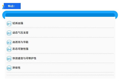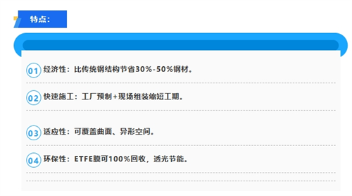 應(yīng)用場(chǎng)景:體育與文化活動(dòng)場(chǎng)館、交通樞紐、購(gòu)物中心中庭、動(dòng)植物溫室、潔凈廠房與污水池覆蓋、野戰(zhàn)醫(yī)院、展覽篷房、城市藝術(shù)景觀裝置。