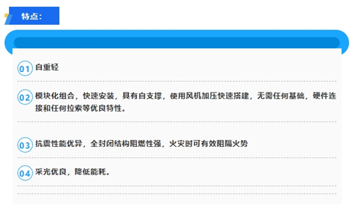應(yīng)用場(chǎng)景:體育場(chǎng)館、展覽中心環(huán)保煤棚、冷鏈物流、應(yīng)急醫(yī)療帳篷、救災(zāi)臨時(shí)住房、充氣拱門、廣告裝置等商業(yè)景觀。