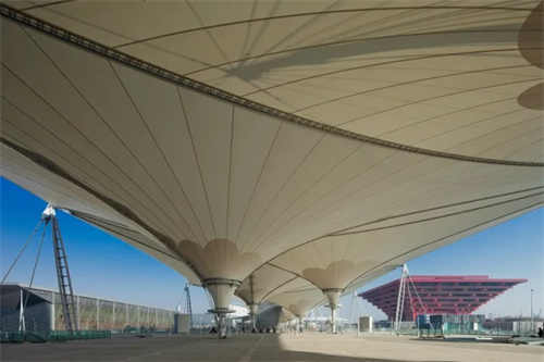 其設(shè)計(jì)攻克了1萬(wàn)多個(gè)鋼結(jié)構(gòu)節(jié)點(diǎn)、7萬(wàn)多張圖紙的復(fù)雜施工挑戰(zhàn),并推動(dòng)了中國(guó)膜結(jié)構(gòu)技術(shù)標(biāo)準(zhǔn)的完善(如安全系數(shù)研究)。這一案例標(biāo)志著膜結(jié)構(gòu)從“實(shí)驗(yàn)性應(yīng)用”向“成熟體系”的跨越,為后續(xù)大型公共建筑提供了重要參考。