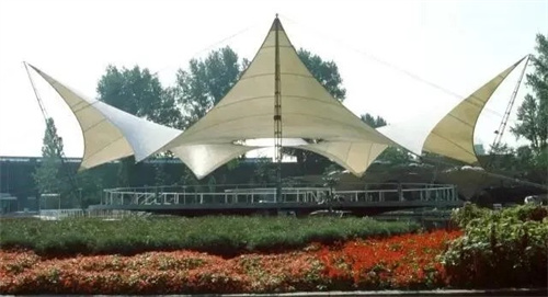 奧托1955年設(shè)計(jì)卡塞爾聯(lián)邦花園展覽音樂廳像是一個(gè)四點(diǎn)支撐的帳篷依靠邊索給膜施加預(yù)應(yīng)力使帳篷的外形呈現(xiàn)兩頭向上、兩頭向下的形狀(馬鞍形)這個(gè)設(shè)計(jì)宣告了帳篷設(shè)計(jì)進(jìn)入了全新的時(shí)代。
