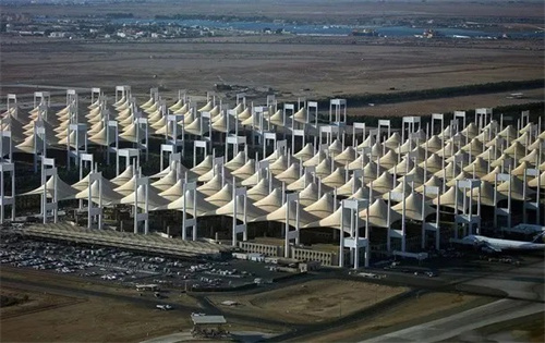 沙特吉達(dá)國際機(jī)場(chǎng)的Hajj航站樓(朝覲航站樓)是全球穆斯林朝覲者前往麥加的重要交通樞紐,航站樓采用獨(dú)特的膜結(jié)構(gòu)帳篷屋頂,由特氟隆涂層玻璃纖維織物制成,可反射76%的太陽輻射,即使在高溫環(huán)境下也能保持室內(nèi)涼爽。是世界上最早也是最大的張拉膜結(jié)構(gòu)之一。由210頂巨大的錐形膜結(jié)構(gòu)單元組成,猶如一群沙漠中的帳篷,既體現(xiàn)了當(dāng)?shù)匚幕瘋鹘y(tǒng),又完美解決了大跨度遮陽問題。