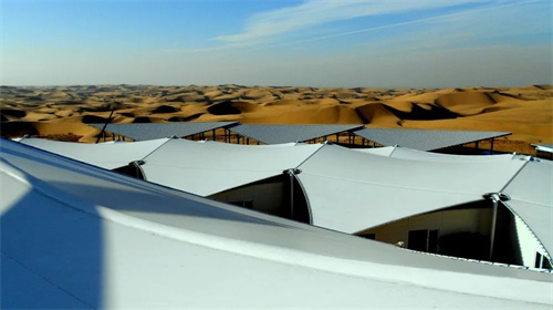 膜結(jié)構(gòu)以“蓮花”為靈感,通過層層張拉膜模擬蓮花的形態(tài),既呼應(yīng)沙漠中沙丘的曲線,又形成獨(dú)特的視覺景觀。這種設(shè)計(jì)不僅美觀,還充分考慮了沙漠環(huán)境中的日照、風(fēng)沙等因素,實(shí)現(xiàn)了功能與形式的統(tǒng)一。采用輕鋼結(jié)構(gòu)作為支撐,搭配高強(qiáng)度膜材,既減輕了建筑自重,又通過特定的鋼板固定流沙,形成類似“沙海浮舟”的獨(dú)特地基基礎(chǔ),確保在沙漠環(huán)境中保持穩(wěn)定。
