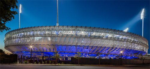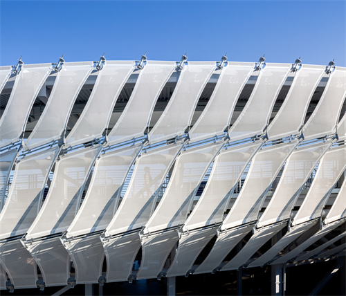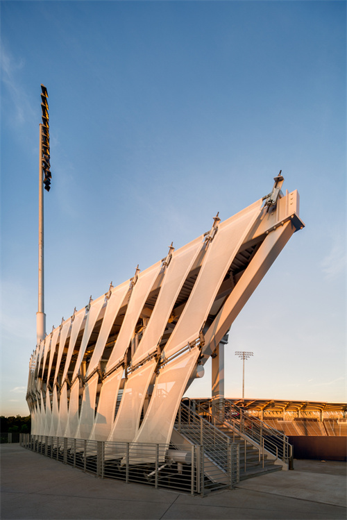 PTFE材料的半透明特性,創(chuàng)造出獨(dú)特的視覺對話。場外的人可以瞥見場內(nèi)活動(dòng)的模糊光影,激發(fā)了好奇心與參與感;場內(nèi)觀眾則能透過表皮看到公園的綠意,緩解了大型建筑的封閉感。