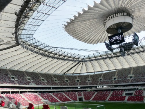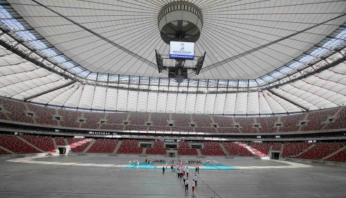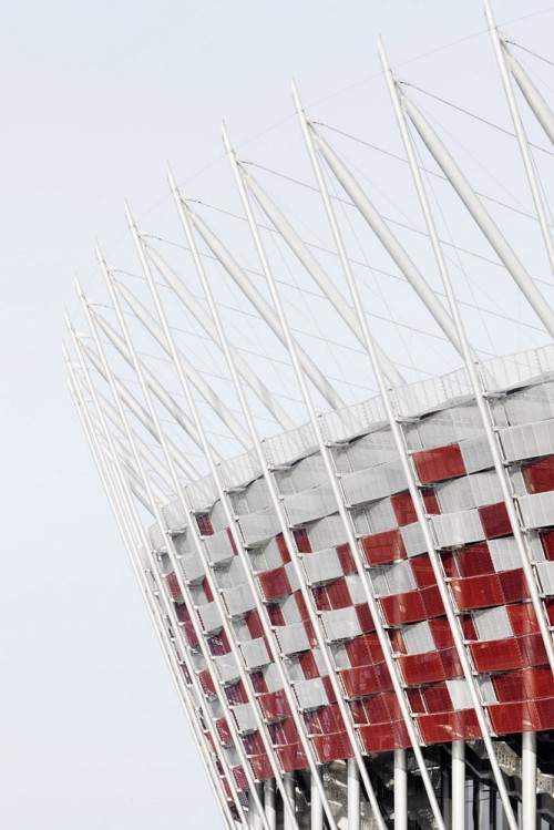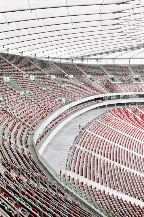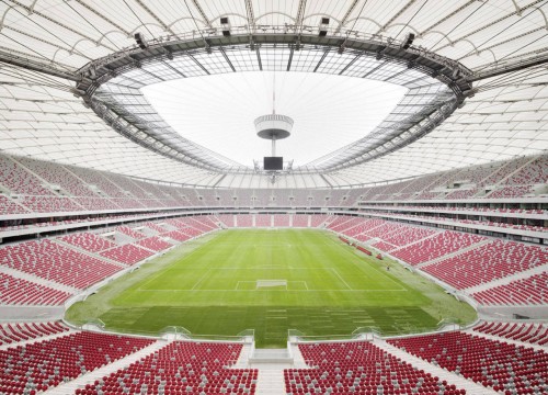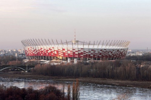 華沙維斯瓦河岸邊的華沙國(guó)家體育場(chǎng),是2012年歐洲杯主賽場(chǎng)之一。紅白外觀呼應(yīng)波蘭國(guó)旗,而最吸睛的當(dāng)屬可自由開(kāi)合的膜結(jié)構(gòu)屋頂,堪稱全球體育場(chǎng)建筑界的“黑科技尖子生”。