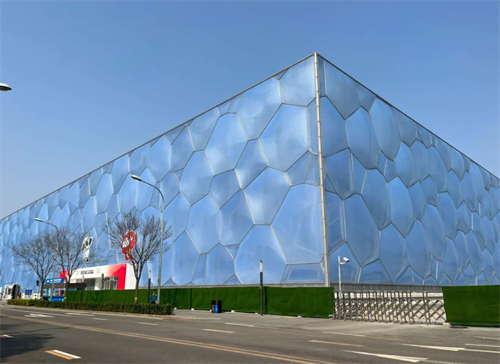 水立方的幕墻由3800多個ETFE(四氟乙烯)氣枕組成,共有11種不同的形狀,氣枕上布滿了肉眼看不見的鍍點,其原材料是一種耐高溫的油墨。
