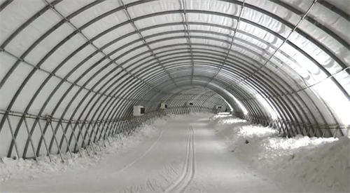 承德氣膜賽道主體以鋼結(jié)構(gòu)龍骨為支撐,采用雙層保溫氣膜結(jié)構(gòu),配置地表制冷和通風(fēng)系統(tǒng),能達(dá)到非雪季廊內(nèi)積雪不融化的效果。