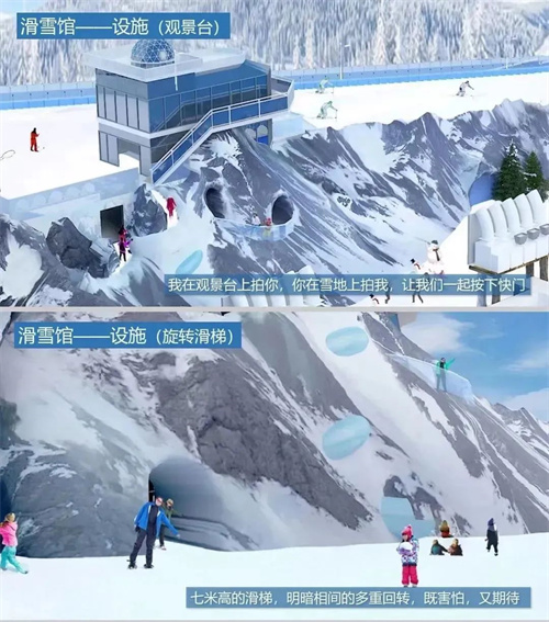 滑雪館內(nèi)的滑雪道長約90米、寬20米,出發(fā)平臺高度10米,滑雪者可乘坐魔毯上升到出發(fā)平臺?;^以經(jīng)典雪域風(fēng)光為主題,打造網(wǎng)紅打卡點。
